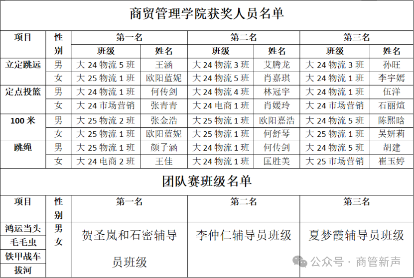 14日上午,运动会正式开幕,伴随着激昂的运动员进行曲,主持人王佳以热情洋溢的话语依次介绍到场嘉宾,他们分别是校长助理曾佑平、学工组长兼学生会指导老师邓小林、商贸管理学院团总支书记夏梦霞、干事贺莲清、郭展鹏、陈军学、体育老师肖国胜、蔡珂及商贸管理学院全体辅导员老师。各班级方阵在操场整齐列队、蓄势待发,随后迈着铿锵有力的步伐依次入场,口号嘹亮、精神抖擞,脸上洋溢的朝气与活力,尽显学子们的蓬勃风采。开幕仪式中,运动员代表、裁判员代表先后登台宣誓,在全场热烈的掌声里,曾校长登台致辞,鼓励同学们以饱满热情投入赛事,在运动中享受快乐、锤炼意志,并宣布运动会正式开始。本次运动会精心设置了短跑、跳远、跳绳等个人竞技项目,以及毛毛虫、鸿运当头、铁甲战车、拔河等团体趣味竞赛项目。迎着秋日的阳光,伴着激昂的呐喊,赛场上,运动健儿们斗志昂扬、奋勇争先:短跑赛道上,他们如离弦之箭全力冲刺,向着终点迸发;跳远赛场上,他们屈膝蓄力、摆臂腾跃,身体在空中舒展成有力的线条,脚掌落向软垫的那一刻,定格下全力拼搏的精彩瞬间;跳绳赛场边,绳影翻飞如银蛇舞动,脚尖轻点地面的轻快节奏里,藏着分秒必争的专注与灵动。团体趣味项目中,队员们默契配合、互帮互助,欢声笑语中尽显协作魅力。每一份拼搏都值得喝彩,每一次协作都闪耀光芒!恭喜以下获奖个人与团队,这份荣誉是你们汗水与默契的见证,期待未来继续并肩,再创精彩!闭幕式上曾佑平校助在致辞中表示,这场趣味运动会既是体能与协作的比拼,更是青春风貌的生动展现,希望同学们将赛场上的热血与韧劲,转化为学习与成长的动力,在未来的道路上继续携手奋进、勇攀高峰。潇湘职业学院商贸管理学院2025年趣味运动会圆满结束,同学们在赛场上凝聚的热血激情、收获的真挚友谊、淬炼的团结品格永不褪色,同学们将带着这份赛场赋予的勇气与温情,并肩奔赴新征程,共同书写学校高质量发展与个人成长进步的崭新篇章!
