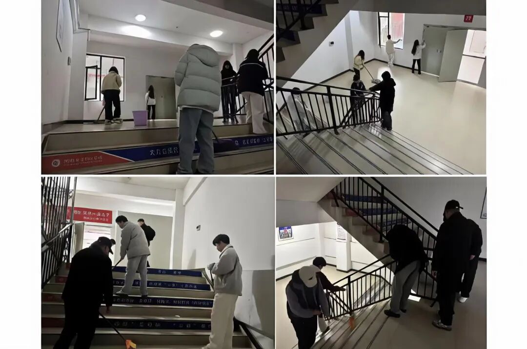 志愿者们在宿舍楼下召开简短动员会,负责人明确本次志愿服务的活动意义、分工安排及安全注意事项,让每一位志愿者都带着明确的目标和严谨的态度参与到活动中。活动现场,志愿者们手持扫帚、抹布、水桶等清洁工具,分工协作、干劲十足,有序前往男、女生宿舍楼楼道开展清洁工作。大家不放过任何一个卫生死角,仔细清扫楼道地面的垃圾与杂物,拿抹布擦拭楼道扶手、门窗边框,将垃圾袋逐一整理打包并及时清运。劳动过程中,志愿者们相互配合、互帮互助,充分展现了青年学子团结协作、吃苦耐劳的良好风貌,忙碌的身影成为宿舍楼道里一道亮丽的风景线。